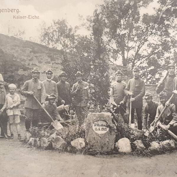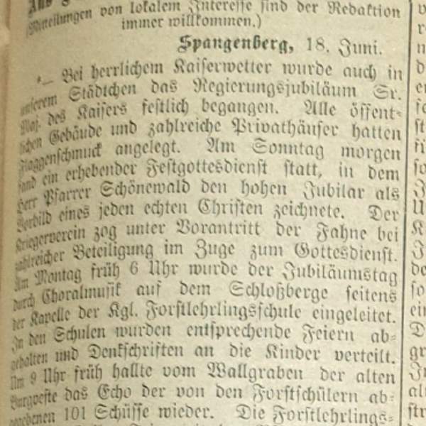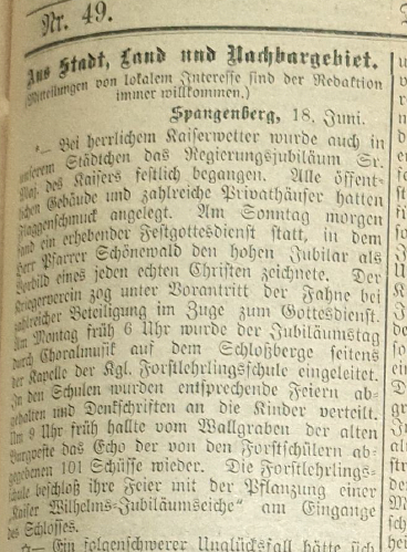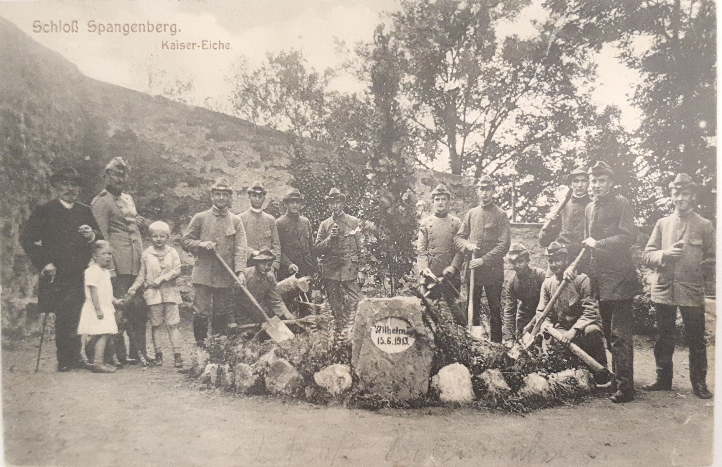 Dort pflanzten die Forstschüler aus Anlass des 25jährigen Thronjubiläums Wilhelms II. einen Eichenbaum, die “Kaisereiche” auf Schloß Spangenberg. Hier ein Bild der damaligen Pflanzaktion sowe ein kleiner Bericht aus der Spangenberger Zeitung von damals.