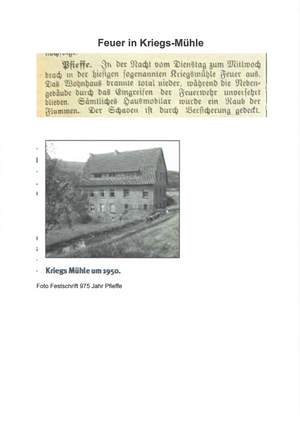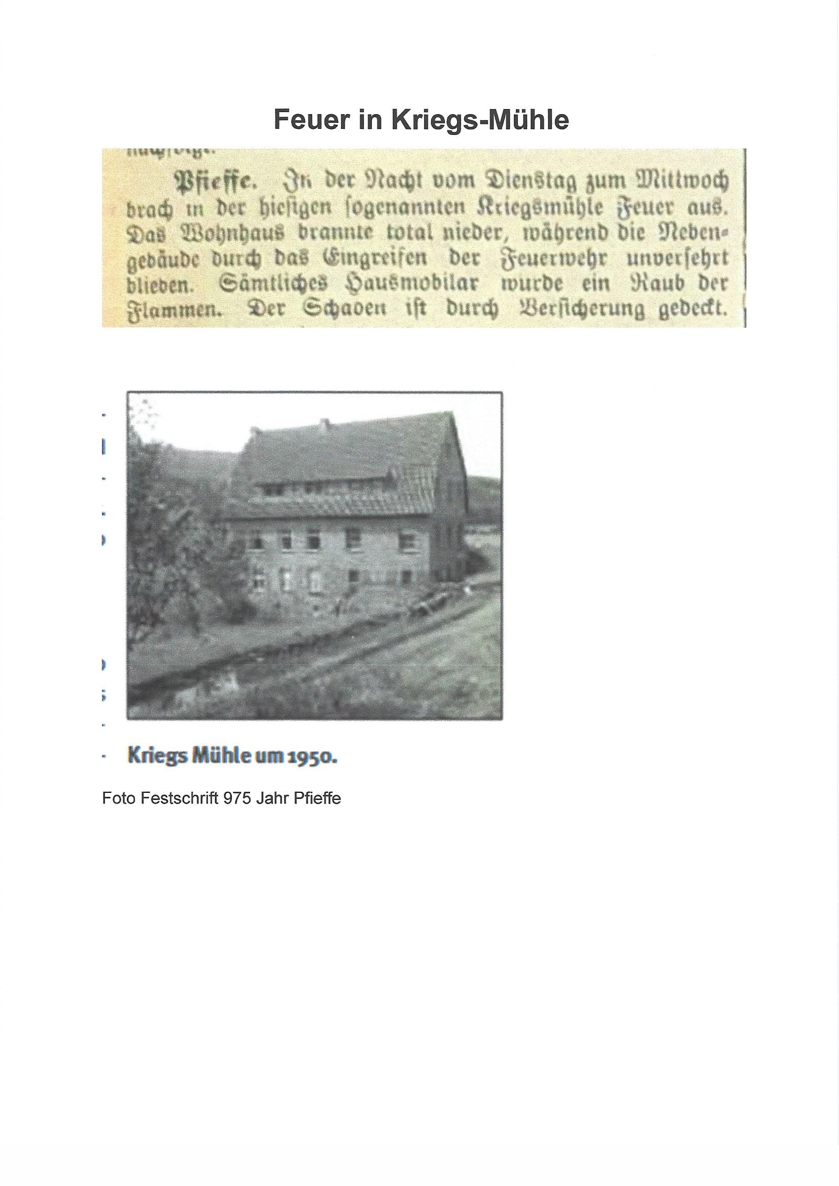 Im Januar 1928 brannte das Wohnhaus der außerhalb des Ortes Pfieffe gelegenen Kriegs-Mühle. Hierüber gab es einen kleinen Bericht in der Spangenberger Zeitung.