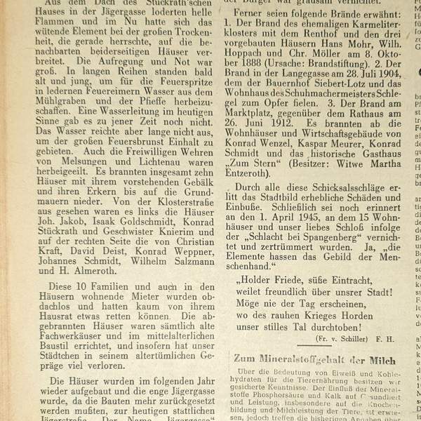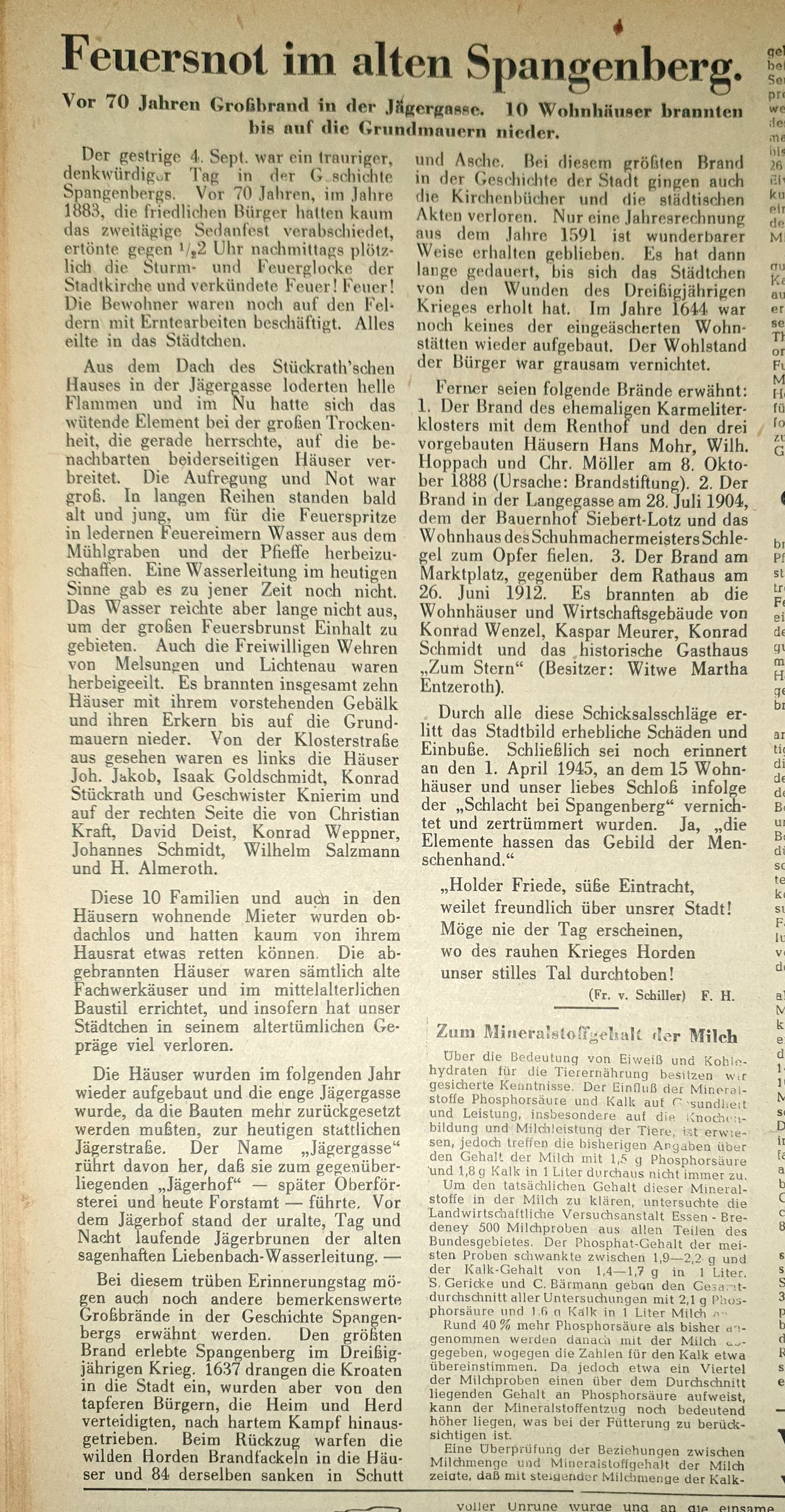 Am 4. September 1873 wütete ein Großfeuer in der Jägerstraße (damals Jägergasse). Dem Feuer sind 10 Häuser zum Opfer gefallen. Hieran erinnerte ein Aufsatz aus der Spangenberg Zeitung aus September 1953. Der Artikel ist nachstehend veröffentlicht. Ferner habe ich 2 Flurkarten beigefügt, und zwar einen Ausschnitt der Jägerstraße aus dem Jahr 1876, dort dürften Häuser rot schraffiert eingezeichnet sein. Ferner füge ich einen Ausschnitt der Flurkarte der Jägerstraße von heute bei.