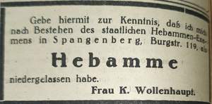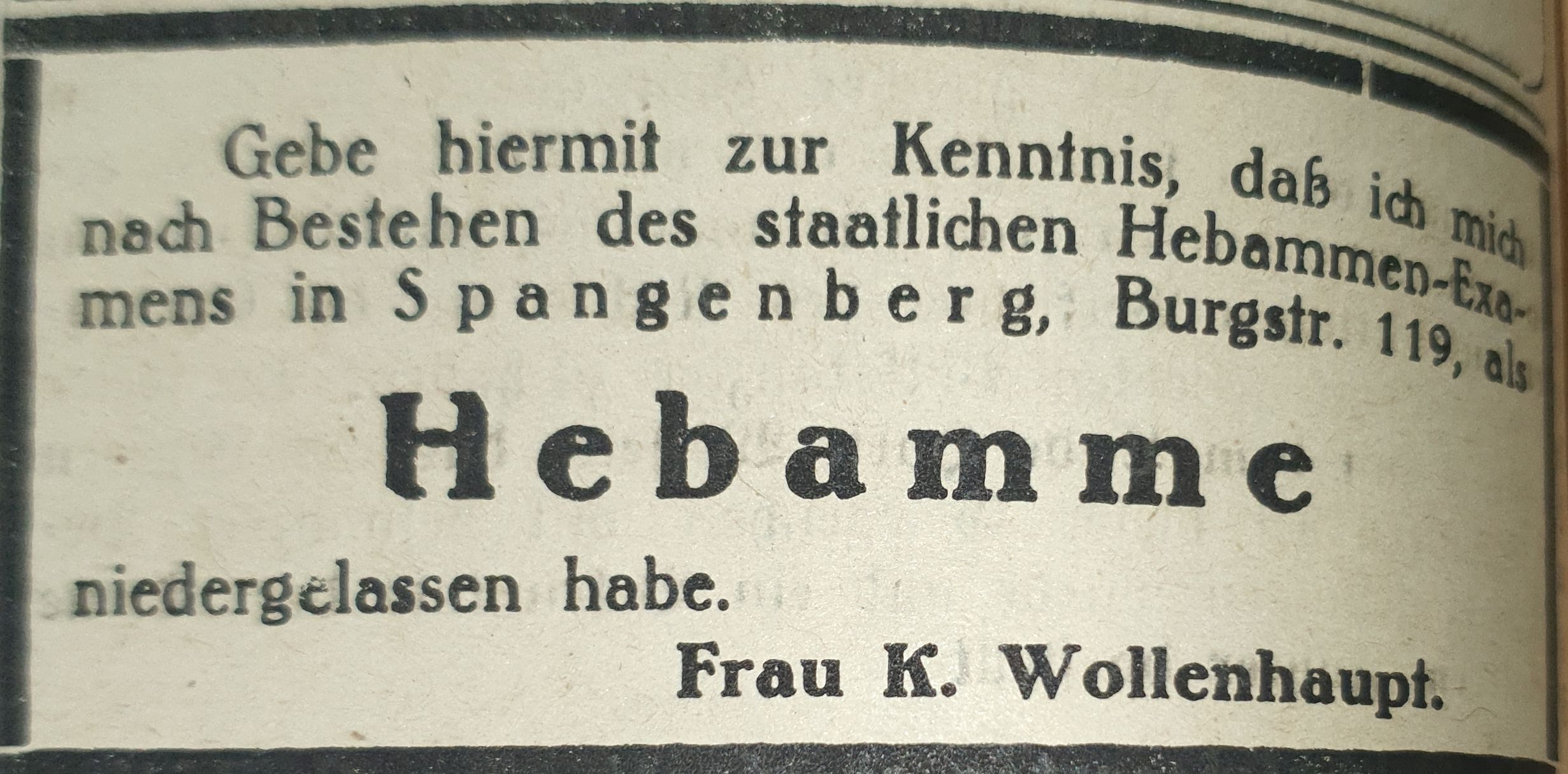 Im Juli 1934 nahm Frau Käthe Wollenhaupt in Spangenberg ihren Dienst als Hebamme auf. Sie hat vielen Spangenbergern und in den umliegenden Ortschaften geholfen “das Licht der Welt” zu erblicken. Die Aufnahme ihrer Tätigkeit kündigte Frau Wollenhaupt am 3.7.1934 in der Spangenberger Zeitung an.