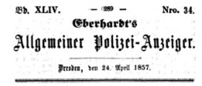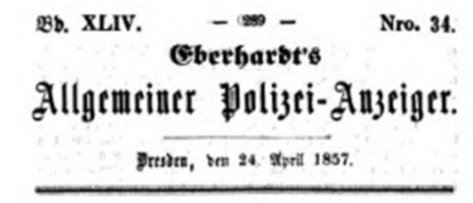 1857 wurde im Allgemeinen Polizei-Anzeiger am 24.04.1857 die nachfolgende Bekanntmachung veröffentlicht.
