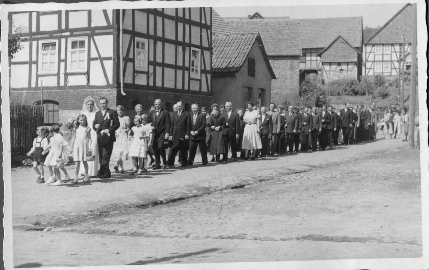 In früheren Zeiten war es bei den dörflichen Hochzeiten Tradition zu Fuß durch das Dorf zur Kirche zu gehen. Die ganze Hochzeitsgesellschaft folgte dem Brautpaar und nahm an der kirchlichen Trauung teil. Nach der Trauung ging die ganze Festgesellschaft wieder durch das Dorf zurück und feierte das jungvermählte Paar gebührend. Auch wurde die gesamte Hochzeitsgesellschaft in einem Gruppenfoto verewigt, bevor bei einem ausgiebigen Festmahl die Hochzeitsfeier - meist in der guten Stube der Brauteltern - stattfand. Hier einige Aufnahmen, welche ich dem Familienarchiv entnommen habe. Die Bilder zeigen einen Hochzeitszug durch Nausis Mitte der 1950iger Jahre.