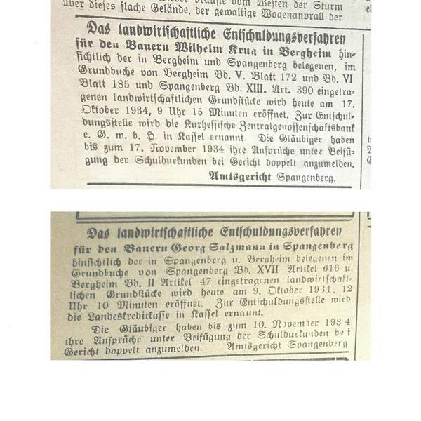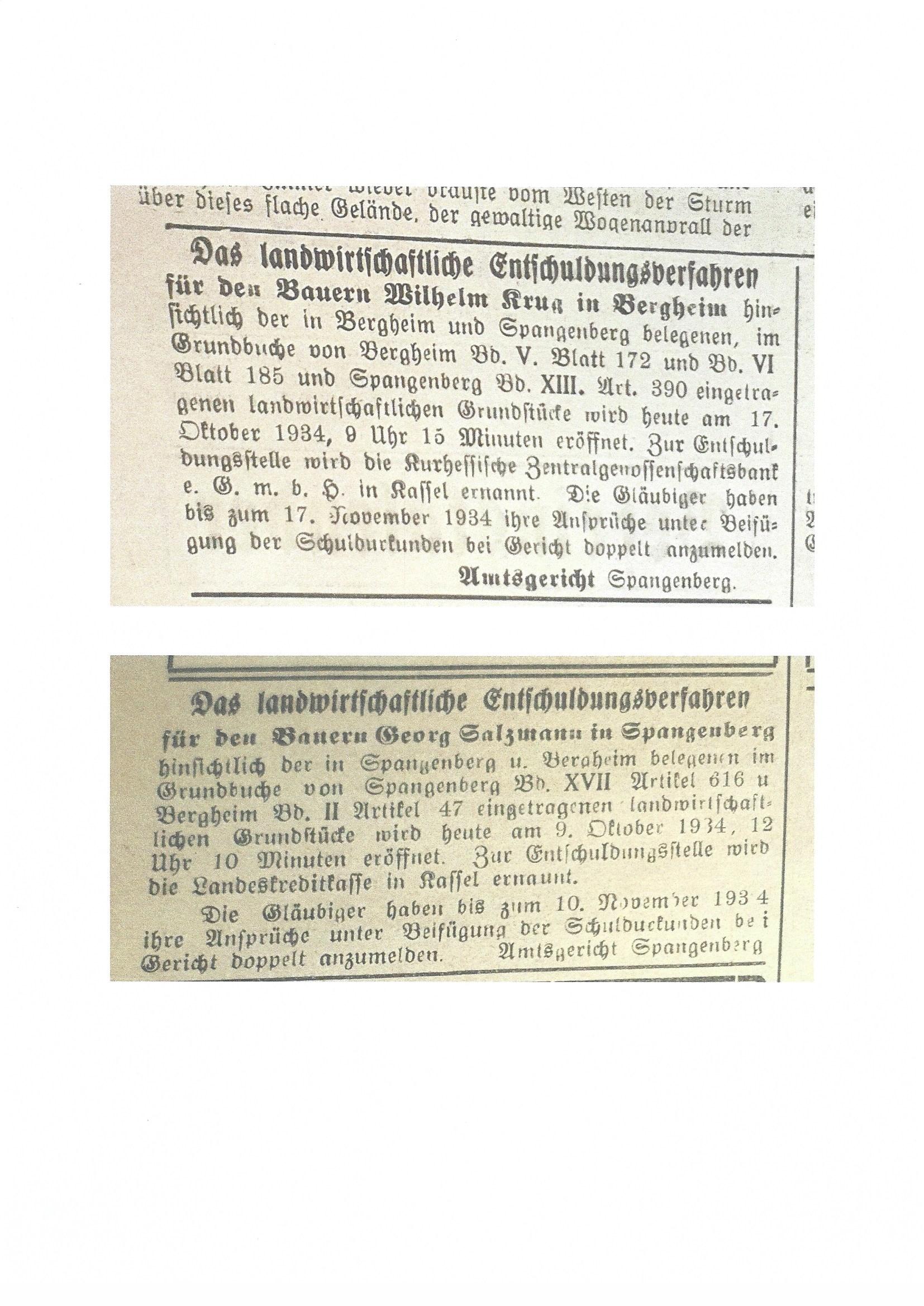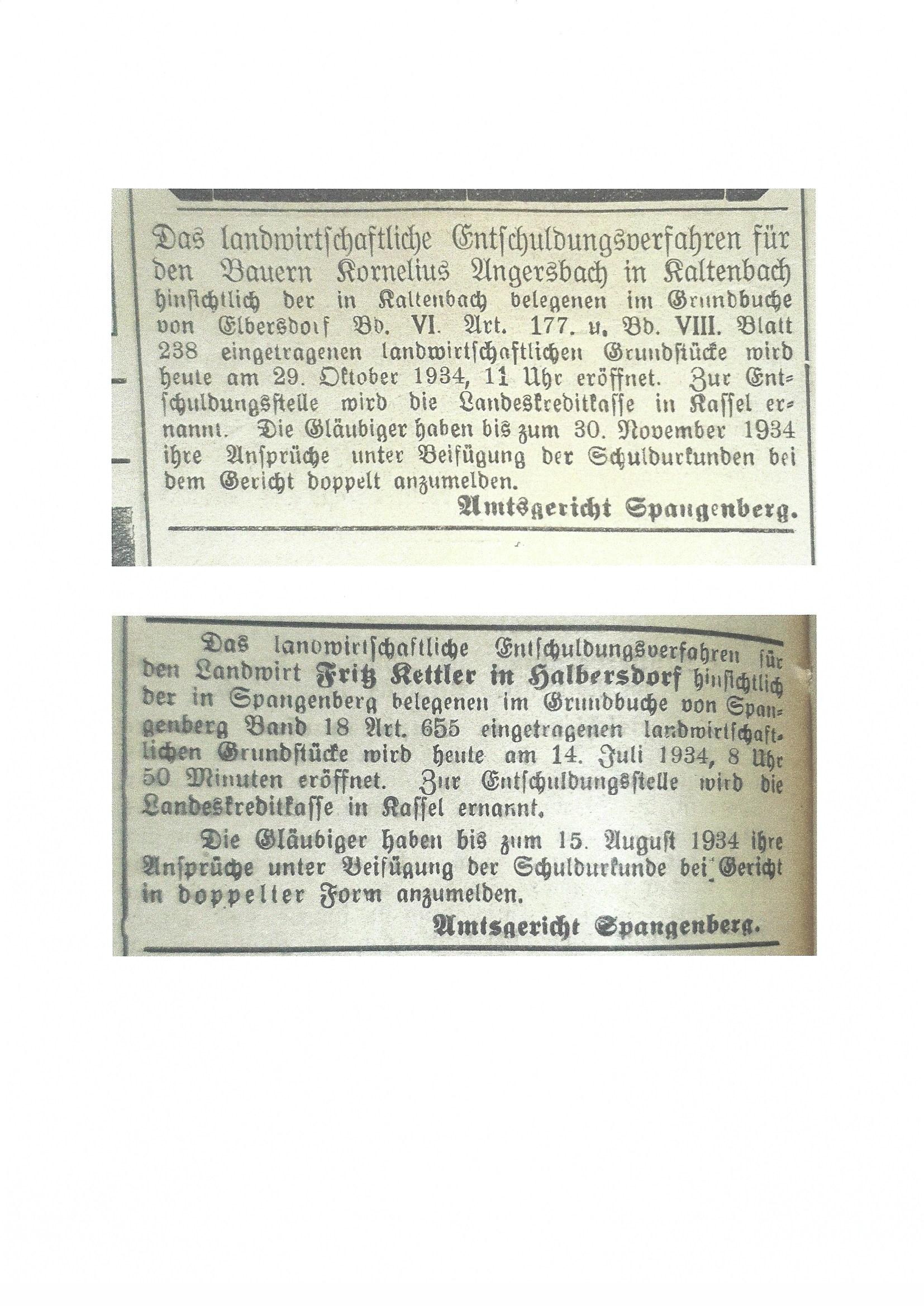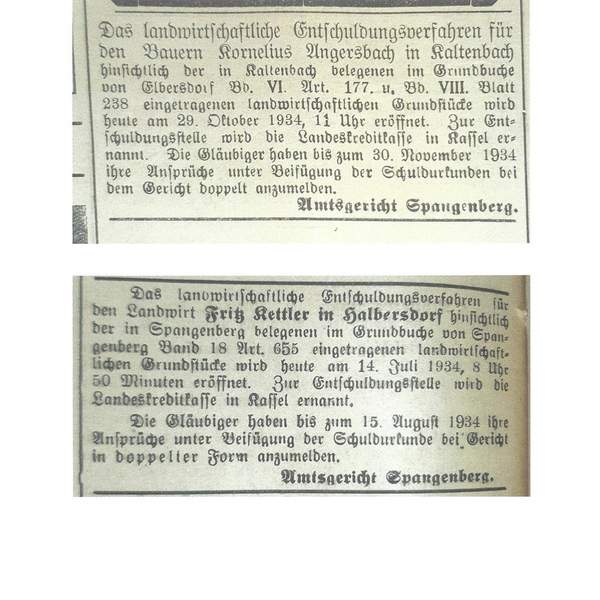 In Spangenberg bzw. Umgebung waren hiervon die Höfe von Kettler (Halbersdorf), Kornelius Angersbach (Kaltenbach), Wilhelm Krug (Bergheim) und Georg Salzmann (Teichmühle in Spangenberg) betroffen. Entsprechend wurde das Verfahren in der Spangenberger Zeitung im Jahr 1934 bekannt gemacht.