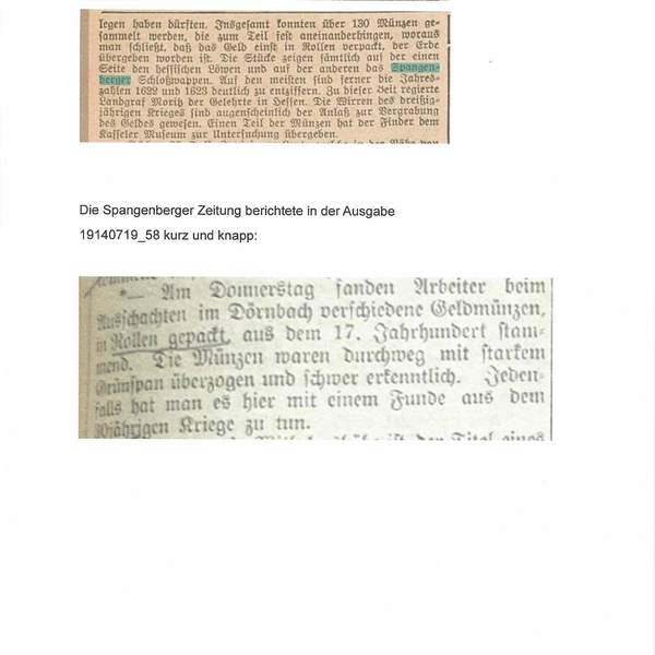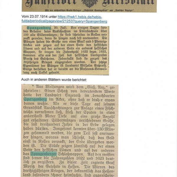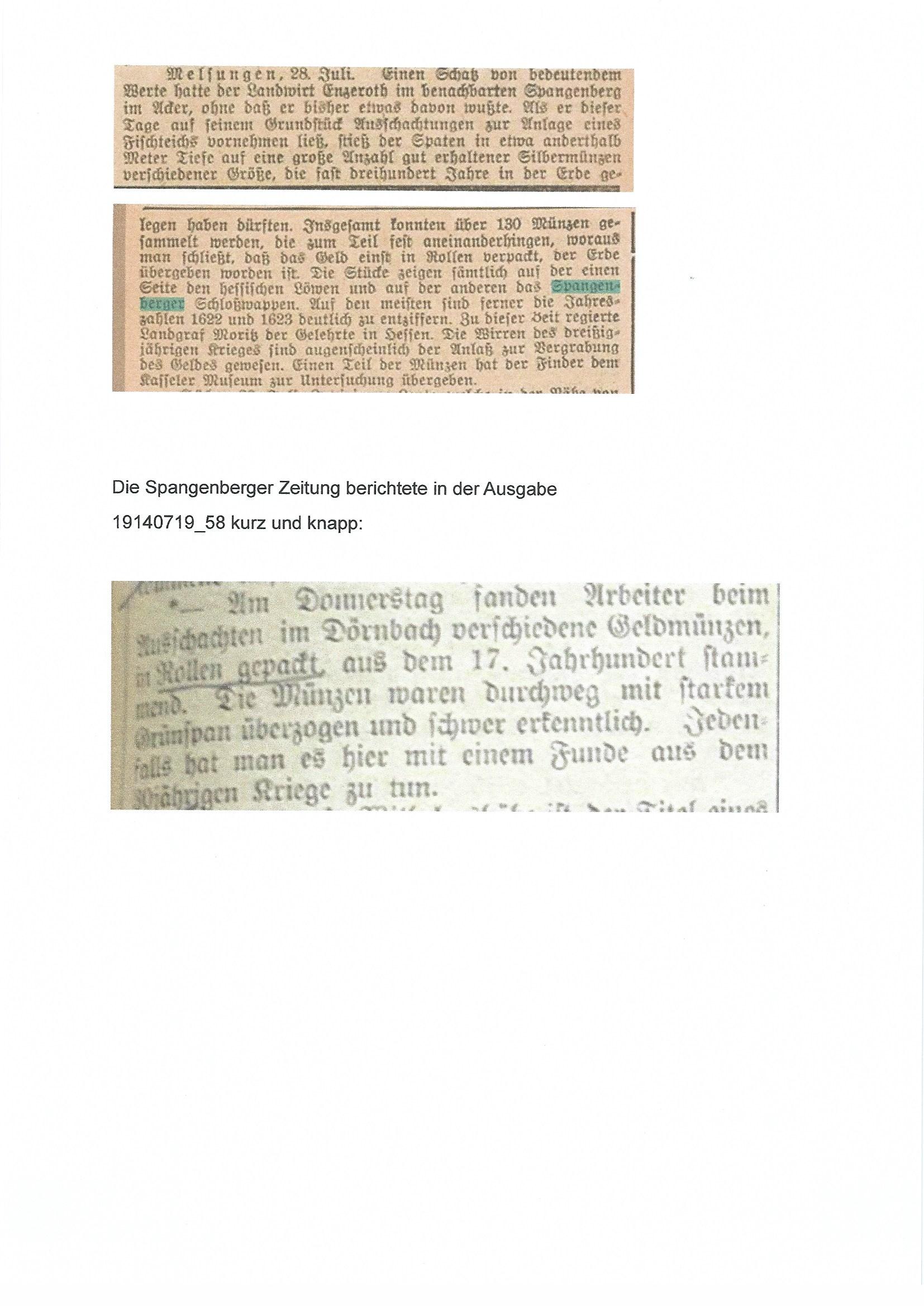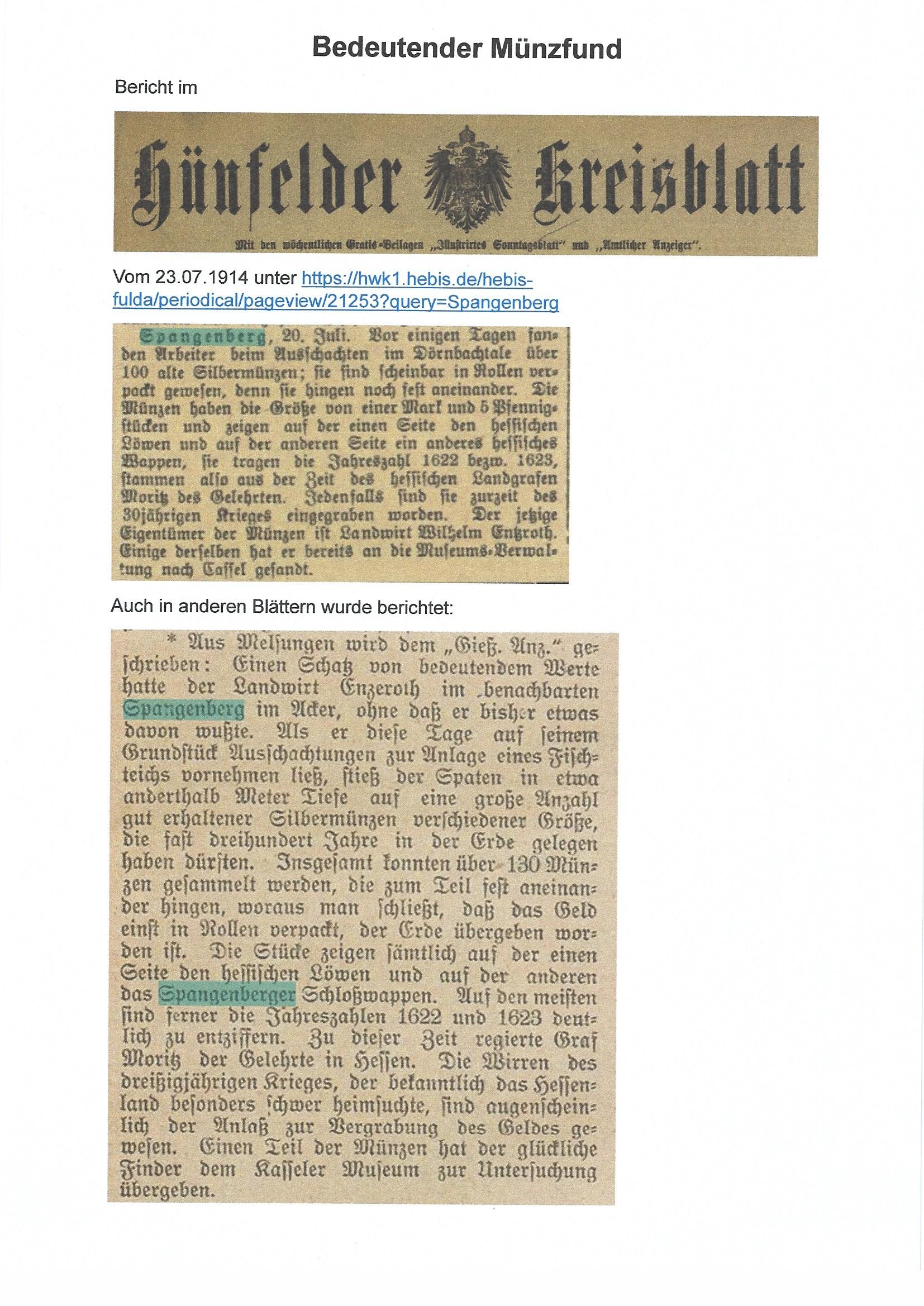 Im Juli 1914 fand der Landwirt Entzeroth beim Ausschachten eine größere Anzahl historischer Münzen. Dies wurde in einigen Blättern publiziert. Neben der Spangenberger Zeitung auch im Hünfelder Kreisblatt s. Link https://hwk1.hebis.de/hebis-fulda/periodical/pageview/21253?query=Spangenberg