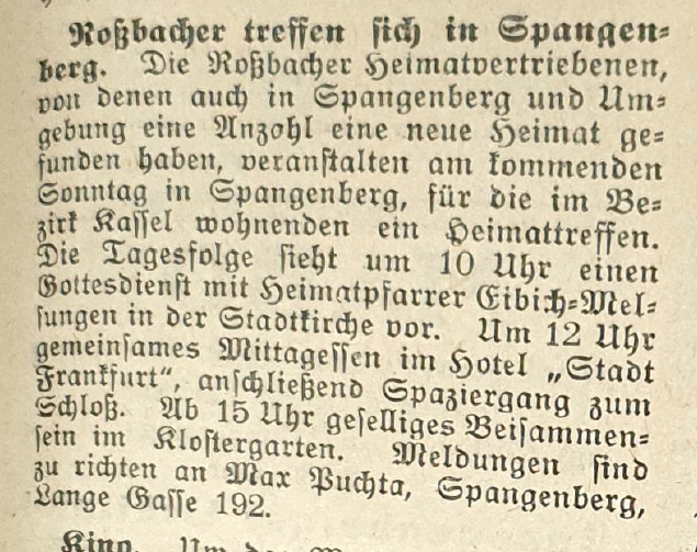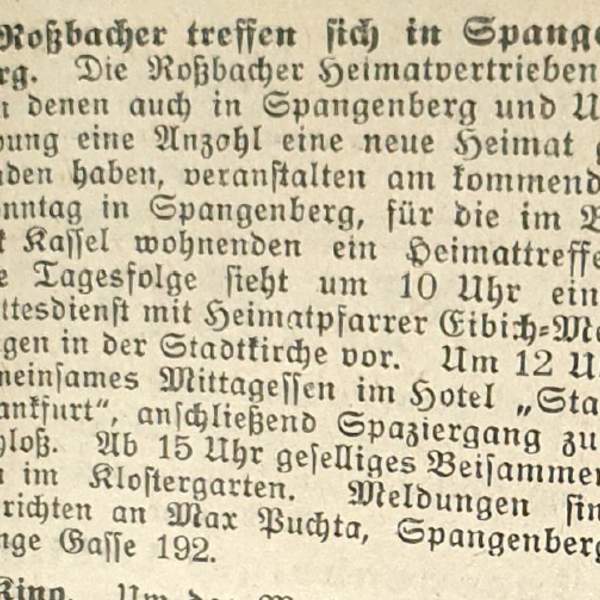 1953 organisierten die aus dem Sudetenland - heute Tschechien - Rossbacher Vertriebenen aus Spangenberg ein Treffen der im Bezirk Kassel wohnhaften Landsleute, die es ebenfalls nach dem Krieg nach Nordhessen verschlagen hatte. 1946 im Juni kam ein Transport der Heimatvertriebenen in Spangenberg an. Es war nicht der einzige Transport, es gab mehrere Transporte die die Flüchtlinge nach Spangenberg brachten. Der im Juni 1946 ankommende Transport bestand ursprünglich aus 40 Viehwaggons jeweils mit 30 Personen besetzt, insgesamt mithin 1200 Personen, welche von Asch über Eger und Waldsasen aus dem Sudetenland abtransportiert wurden. Der Zug kam über Bayern nach Hessen, die Waggons wurde entlang der Strecke “entladen” und die Personen fanden eine neue Heimat. U.a. landete ein Waggon mit Rossbachern in Spangenberg, die Liste der jenigen Personen, welche hier ankamen füge ich bei (auch meine Eltern und ein Teil meiner Großeltern befanden sich darunter).