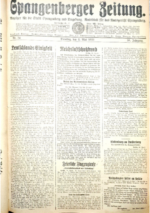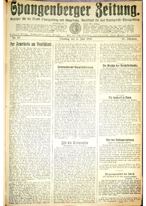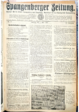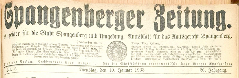 Wer hat evtl. die Ausgaben der Spangenberger Zeitung der kompletten Jahrgänge 1917, 1921, 1931 und 1935 - oder auch einzelne Exemplare? Bitte melden, wir suchen dringend diese Jahrgänge zur Komplettierung des Archives. Bitte Dateirn öffnen und Hinweis lesen.