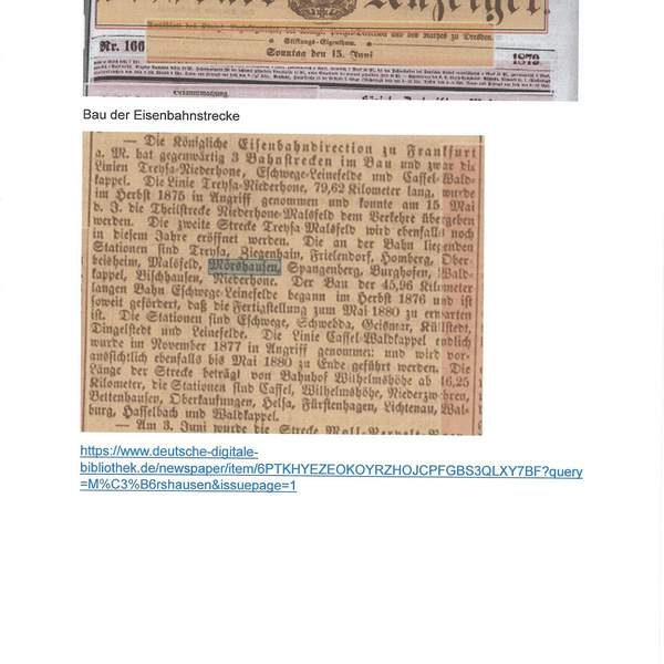 Am 15. Mai 1879 wurde die Teilstrecke der “Kanonenbahn” von Niederhohne nach Malsfeld übergeben, wie der Dresdner Anzeiger vom 15.6.1879 berichtete.